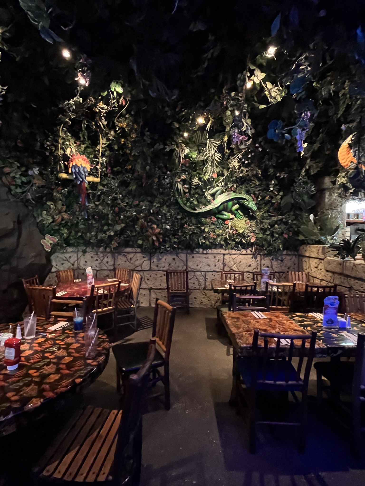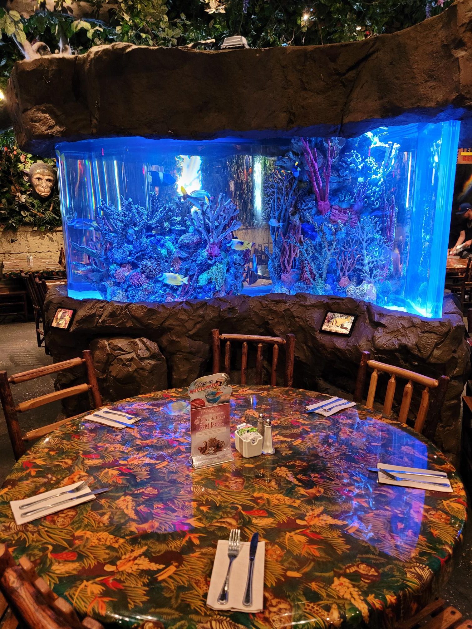Once your table is ready and your “Safari Party” will be called to meet your guide at the towering blue fish tanks. Your journey into the Rainforest Café is about to begin.